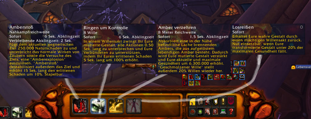 Die kommt aus dem Becken links-vorne. Diese wird sofort angetankt bzw. mit Irreführung oder Schurkenhandel auf den nichtverwandelten Tank gebracht. Wir haben gesehen, dass wir in der Phase mit der Hau-drauf-Taktik besser fahren: also ab dem Zeitpunkt Heldentum gezunden und jeder, der in ein mutiertes Konstrukt verwandelt wird, attackiert die Bernmonströsität. Das Ziel mit Rechtsklick ins Target nehmen und mit Funktion 1 angreifen bzw. die Bernexplosion der Bernmonströsität unterbrechen. Mit Funktion 2 die eigene Bernexplosion unterbrechen, mit 3 verlorenen Willen und Gesundheit auffüllen. Funktion 4 wird bei dieser Taktik nicht mehr benötigt, außer die Gesundheit fällt unter 20%. Es besteht immerhin die Chance neuerlich in ein Konstrukt verwandelt zu werden. ABER WICHTIG: Bevor ihr zum trinken lauft, auch wenn ihr nur 20% Wille besitzt,